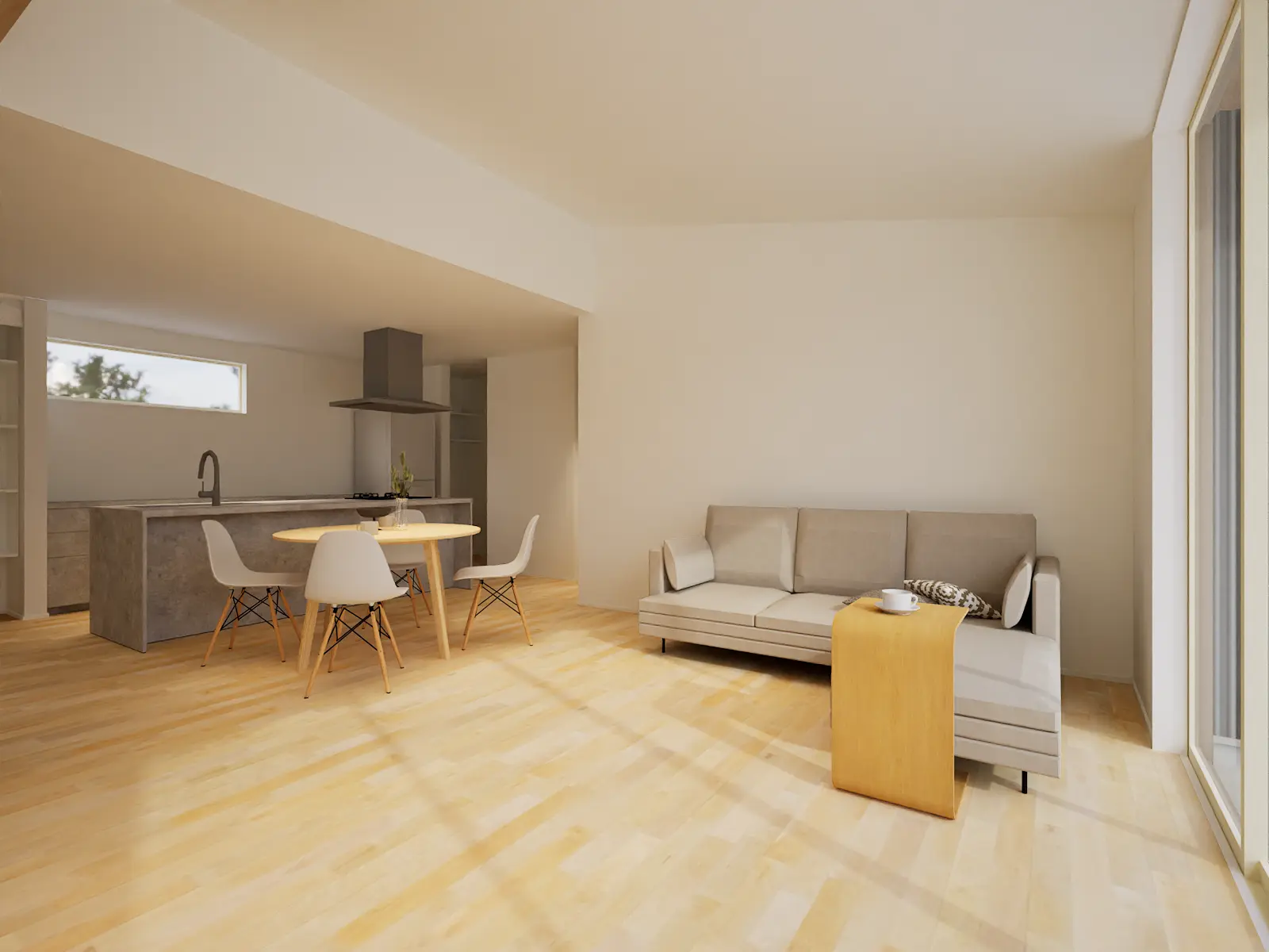 勾配天井のリビングはやわらかな光に包まれ