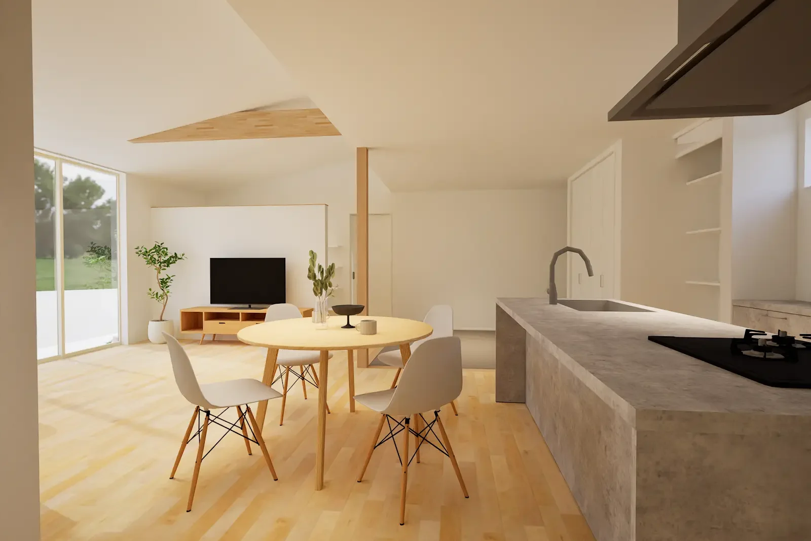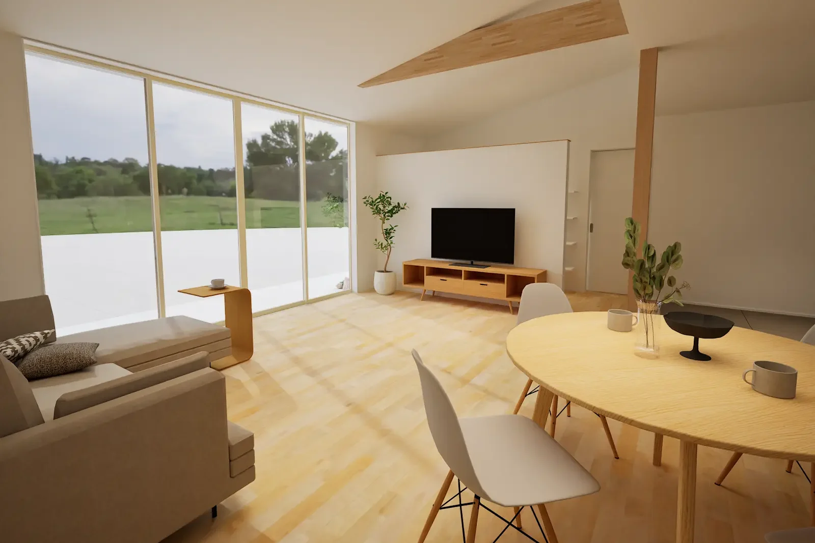 勾配天井のリビングはやわらかな光に包まれ