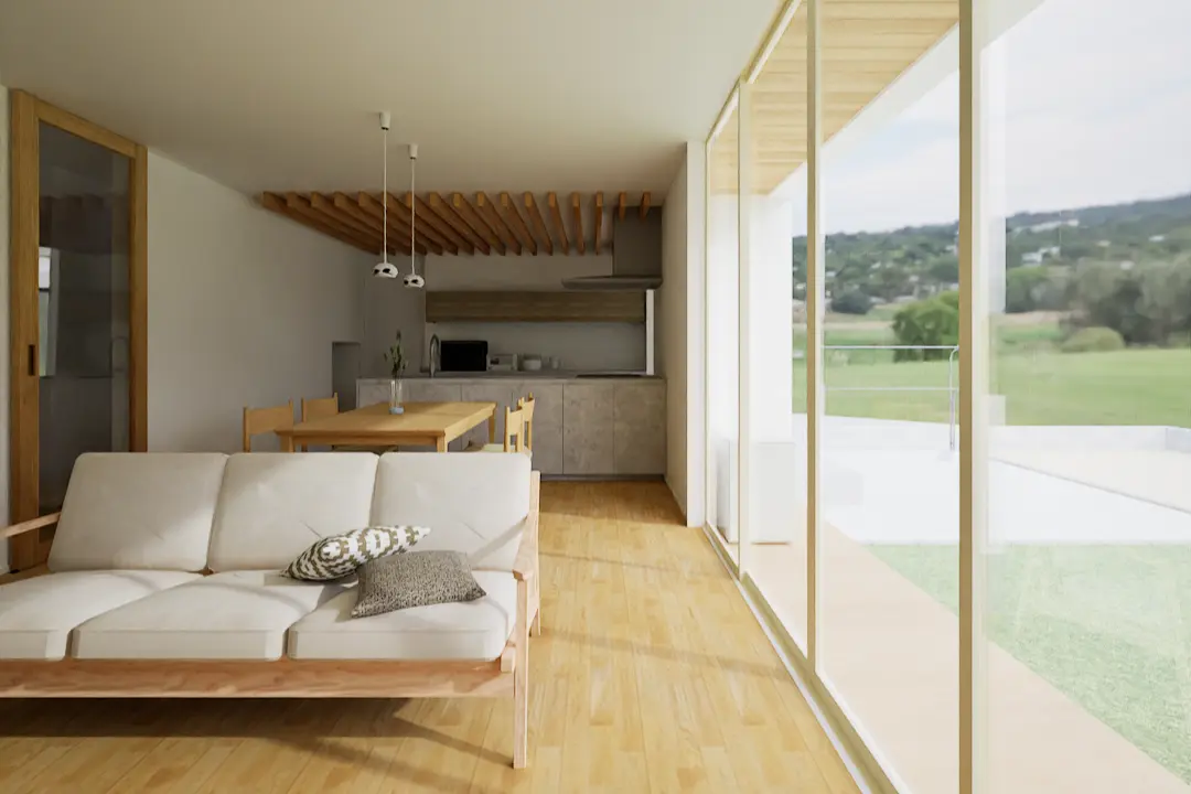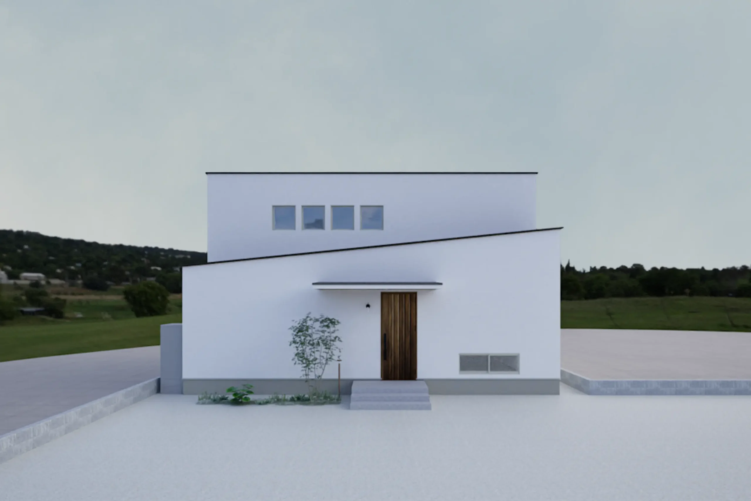 白い塗り壁、大開口の窓、