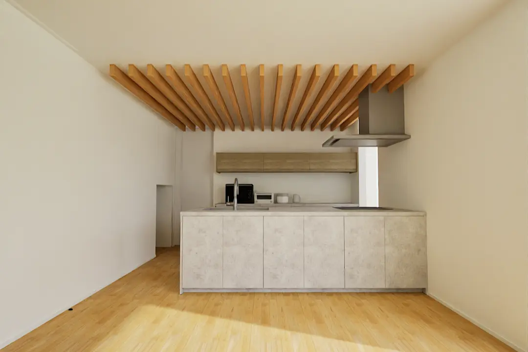 ルーバー天井の陰影に、そっと光が重なっていく。