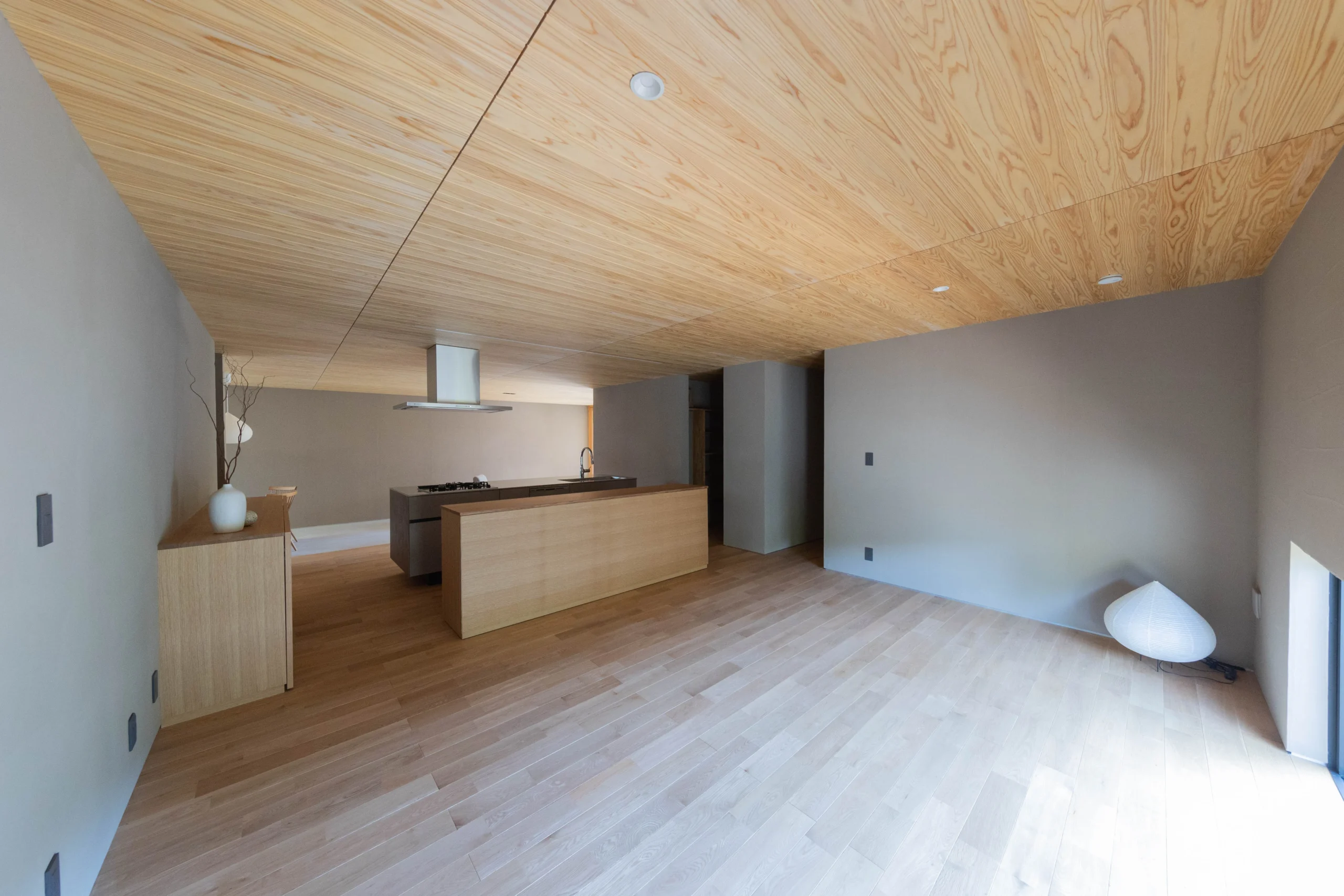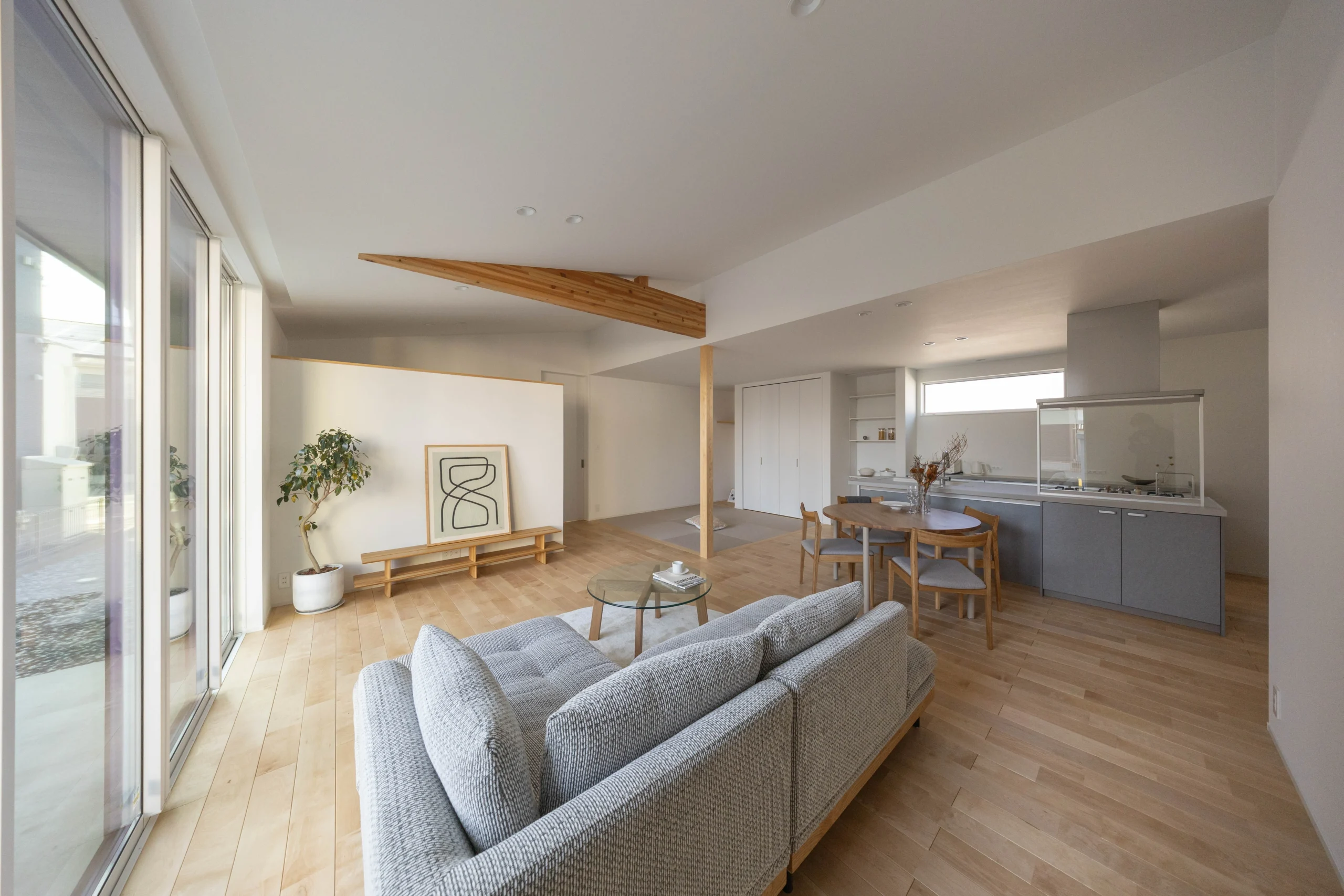 大きな窓と桧張りの勾配天井で、