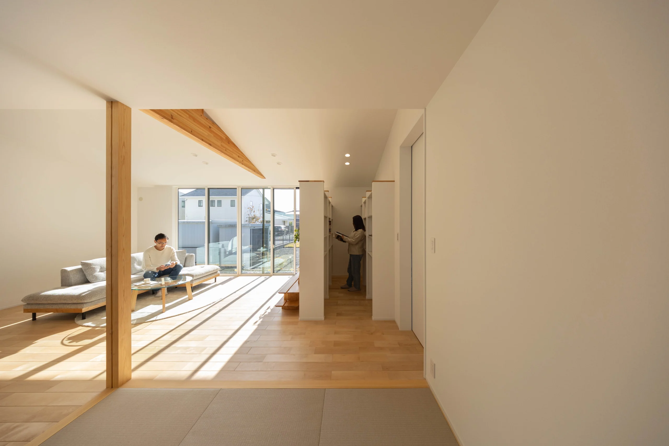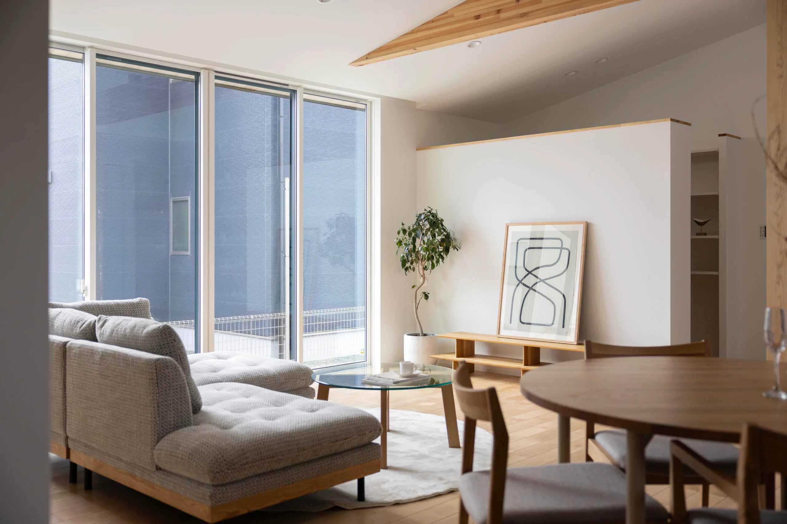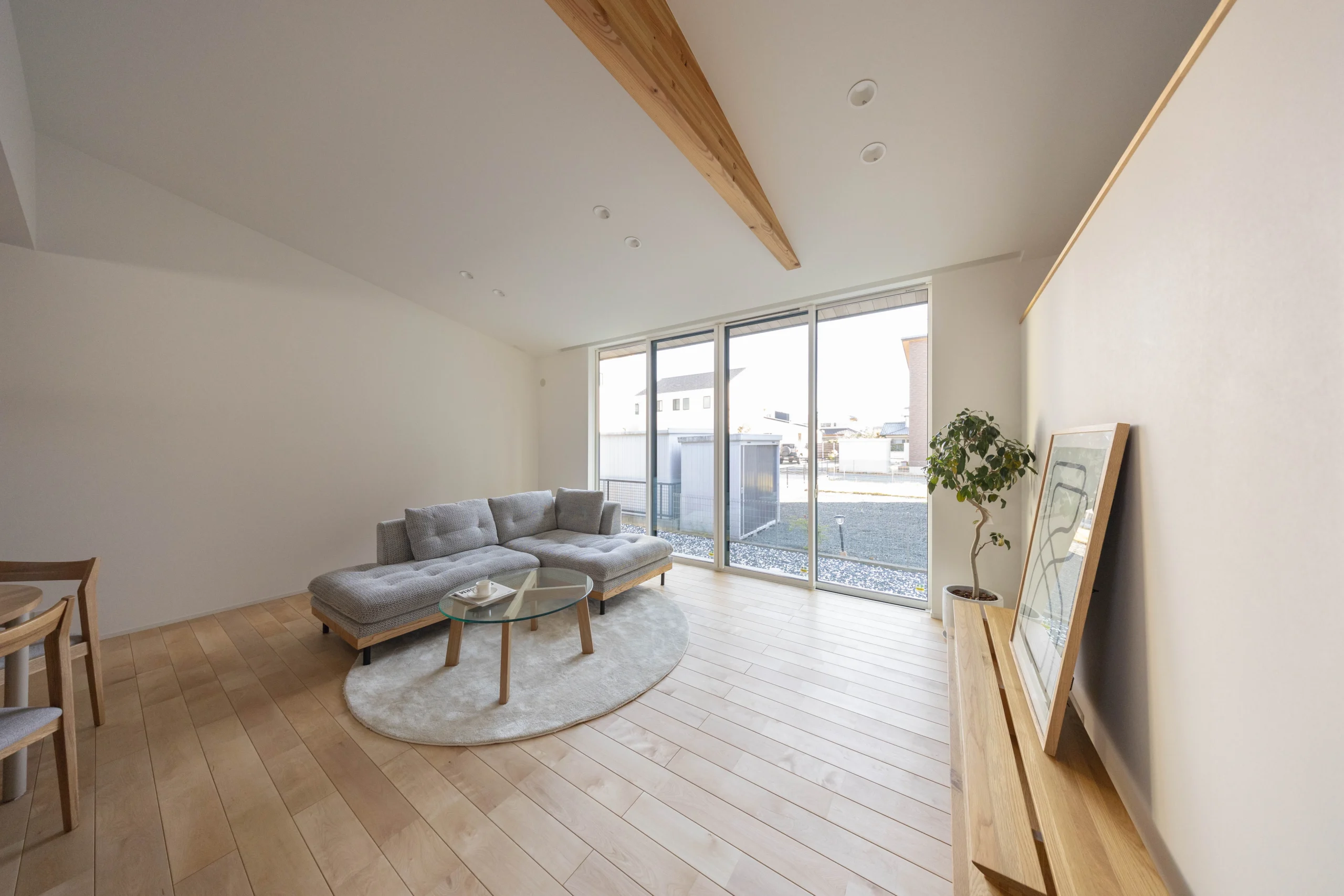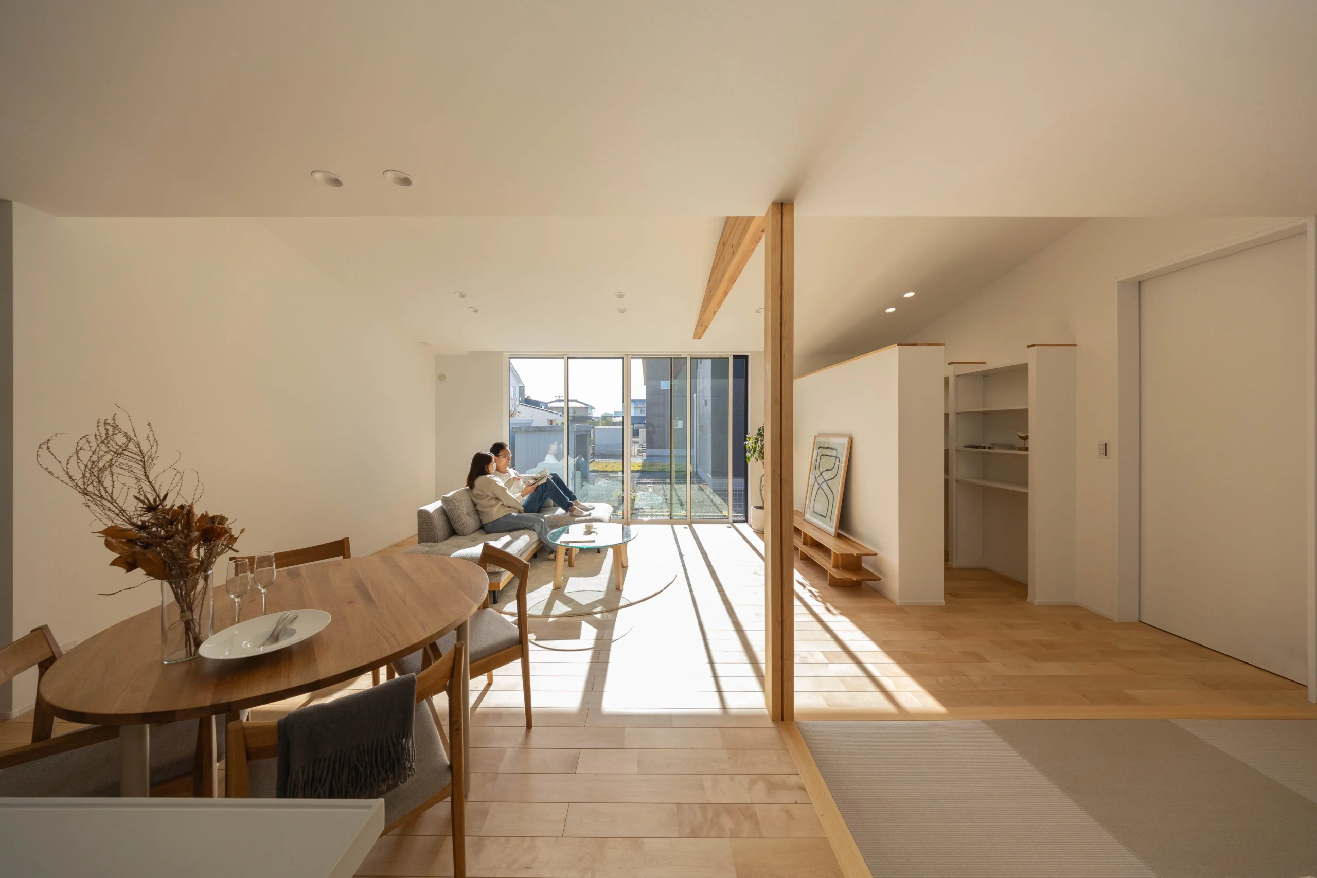 勾配天井と梁がつくるのびやかなLDKは、